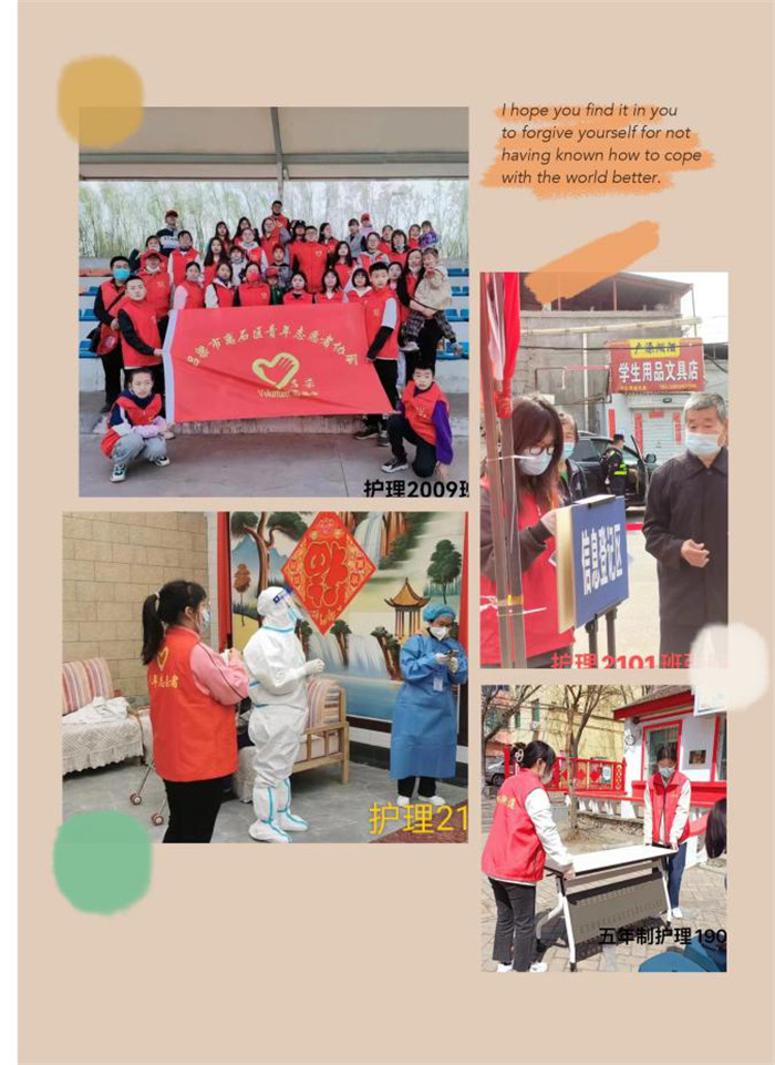 为充分发挥共青团组织引领作用,号召广大团员青年投身于抗疫行动,发挥先锋模范作用,弘扬志愿服务精神,坚决做到疫情防控阻击的战斗者、宣传者、参与者。院团委发出疫情防控倡议书,并收到学生们积极响应和反馈。按照就近原则,在兼顾完成学习任务的前提下,学生们主动亮身份、当先锋、作表率,主动到所在社区疫情防控办报到,配合社区开展核酸检测、环境消杀、秩序维护、心理服务、卡口执勤等志愿服务。另有医学护理专业特长的学生积极参与本地卫生防疫,切实做到“帮忙不添乱,援手不缺位”。